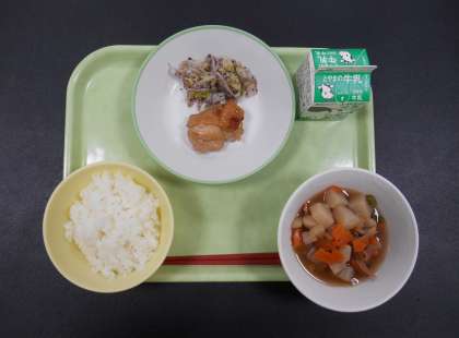 今日の献立は、 「ごはん、牛乳、照焼きチキン、ゆかり和え、里芋といかの煮物」でした。
