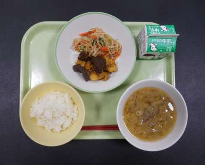 今日の献立は、「ごはん、牛乳、鶏肉とレバーのカレー風味、ナムル、たら汁」でした。