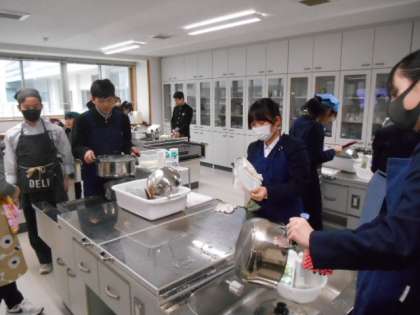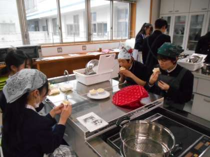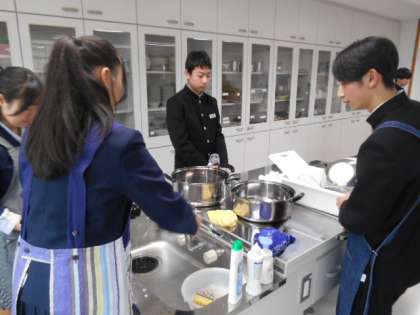 生徒たちは、班ごとに分担しながら協力し合い、調理実習に取り組んでいました。