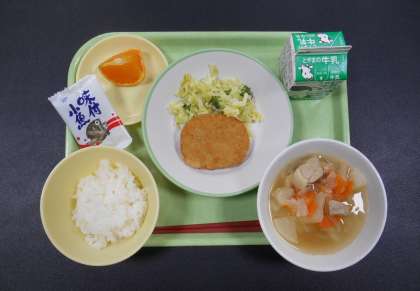 今日の献立は、 「ごはん、牛乳、コロッケ、グリーンサラダ、ポトフ、甘平、味付け小魚」でした。