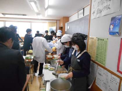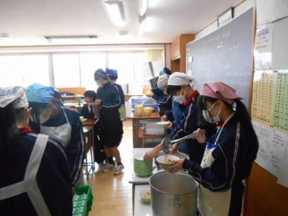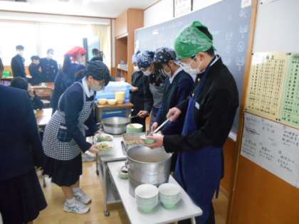 給食当番の生徒たちは、手際よく、協力し合いながら給食の準備を進めています。