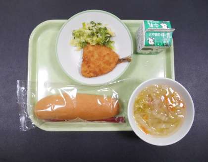 今日の献立は、 「コッペパン、牛乳、、あじフライ、ブロッコリーサラダ、ひよこ豆のスープ」でした。