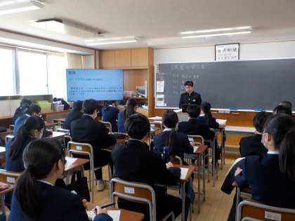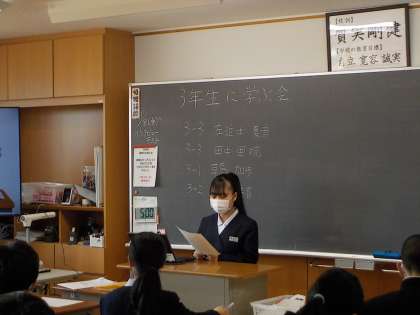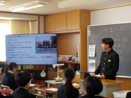 卒業を間近に控えた3年生8名から、中学校生活のアドバイスや体験談を聞きました。多くの生徒が、メモを取りながら、真剣に聞き入っていました。