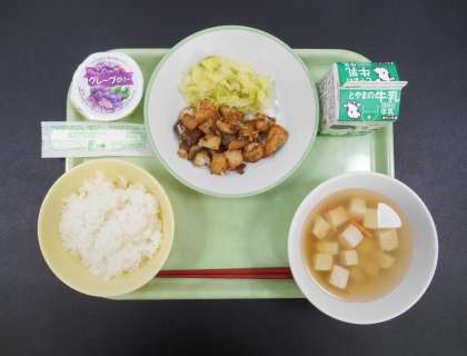 今日の献立は、 「ごはん、牛乳、魚とじゃがいものえごまみそからめ、ゆでキャベツ、すまし汁、ぶどうゼリー」でした。