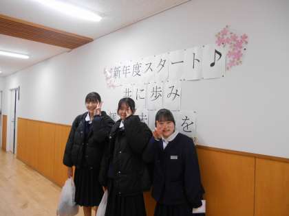 今日は、体育館に2・3年生が集い、離任式、着任式、始業式を行います。午後に、入学式の準備を行います。