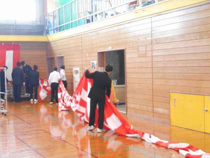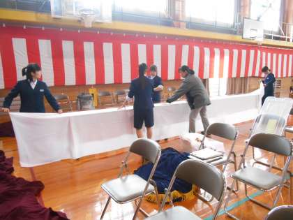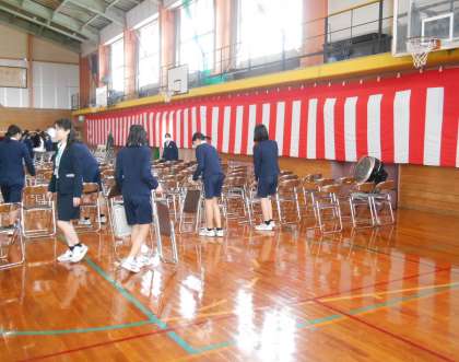 午後から3年生は、明日の入学式の会場設営などの準備を行いました。