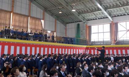 写真下:2・3年生の方を向いて合唱を聴いている新入生