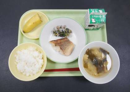 今日の献立は、「ごはん、牛乳、赤魚の塩焼き、ゆかり和え、みそ汁、バナナ」でした。