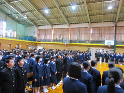 執行部・各委員会の紹介に続き、3年生が校歌を披露し、最後は全校生徒で斉唱しました。