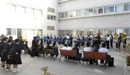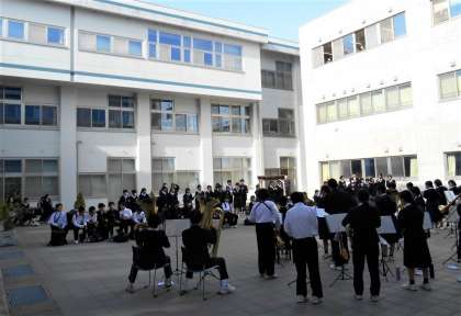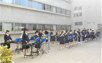 吹奏楽部は、中庭の「いわせテラス」で、ミニコンサートを行いました。