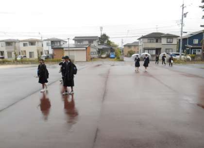 生徒たちの登校時は、霧のような細かい雨が降っていました。