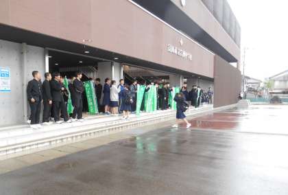 今朝は、たくさんの2年生の生徒たちがあいさつ運動を行っていました。