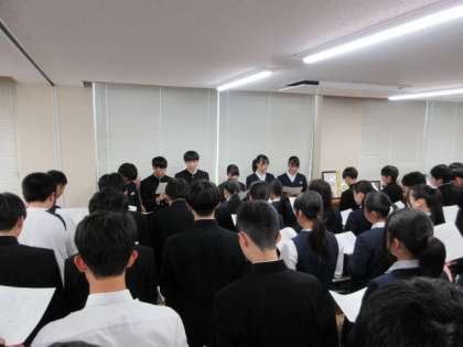 広島平和記念公園において、「岩中平和宣言」を唱和し、みんなで作った千羽鶴を捧げるまでの流れを練習しました。