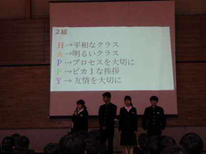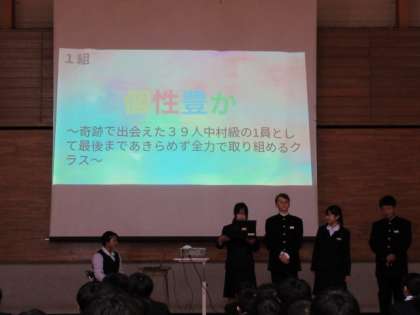 学年生徒会が中心となり、学級目標と学年目標の発表を行いました。