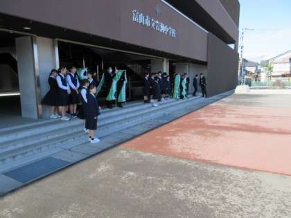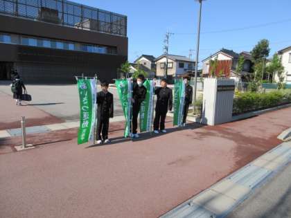 今朝は、1年生の希望参加でしたが、積極的に参加してくれた生徒が多く、さわやかな天気のもと、大きな声であいさつを呼びかけていました。
