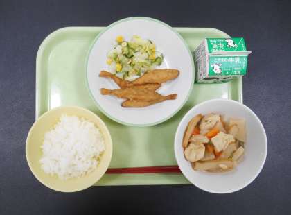 今日の献立は、「ごはん、牛乳、わかさぎのフリッター、コールスローサラダ、関東だき」でした。