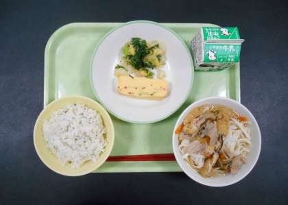今日の献立は、「菜めし、牛乳、千草焼き、おひたし、かやくうどん」でした。