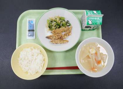 今日の献立は、「ごはん、牛乳、きびなごのさくさく揚げ、ごまびたし、呉汁、のり佃煮」でした。