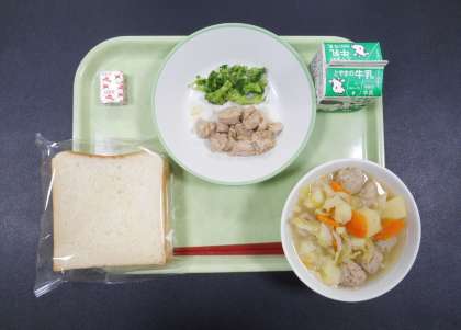 今日の献立は、「食パン、牛乳、鶏肉のレモン煮、ゆでブロッコリー、野菜のスープ煮、ポケットチーズ」でした。