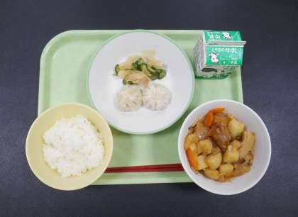 今日の献立は、「ごはん、牛乳、えび包子、華風和え、酢豚」でした。