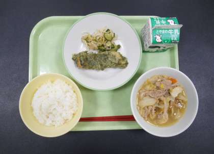 今日の献立は、「ごはん、牛乳、魚の磯辺揚げ、甘酢和え、すきやき」でした。