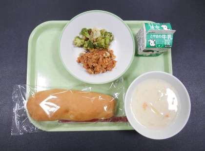 今日の献立は、「コッペパン、牛乳、ポークチャップ、ビーンズサラダ、クリームスープ」でした。