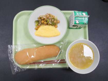今日の献立は、「コッペパン、牛乳、チーズオムレツ、きのこと豆のアヒージョ、ポトフ」でした。