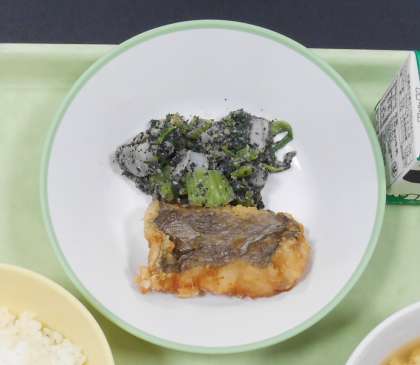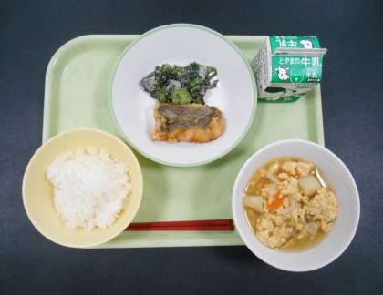 今日の献立は、「ごはん、牛乳、魚の竜田揚げ、よごし、卵とじ」です。