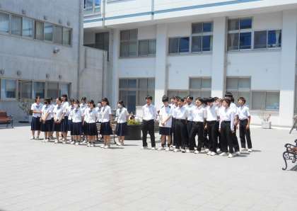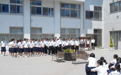 昼休みに、いわせテラスで、生徒会執行部主催の「岩中三輪ピック」の「校歌部門」が行われました。今日は、2年生の2クラスです。
