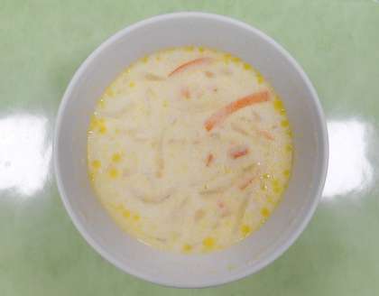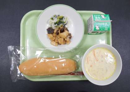 今日の献立は、「米粉コッペパン、牛乳、鶏肉とレバーのりんごソースからめ、大根サラダ、ビーンズポタージュ」でした。