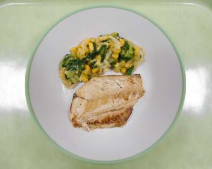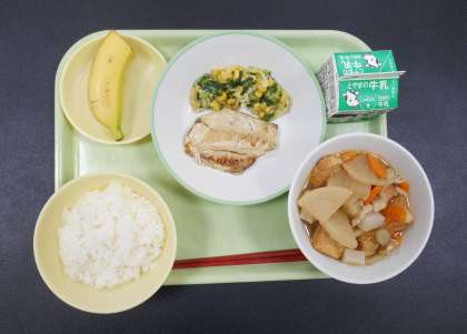 今日の献立は、「ごはん、牛乳、さばの塩焼き、コーン和え、鶏肉と根菜の煮物、バナナ」でした。