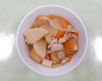 「鶏肉と根菜の煮物」は、鶏肉に、根菜の大根、人参、ごぼう、そして根菜からつくられたこんにゃくの他に、厚揚げも入っていて食べ応えがあり、とてもおいしかったです。