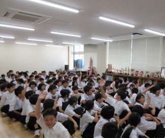 昨年度の体育大会や合唱コンクールの動画を見て、それぞれの行事をイメージをしながら、行事に向き合う姿勢についての話を聴きました。