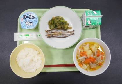 「ごはん、牛乳、ししゃものから揚げ、茎わかめの中華あえ、塩肉じゃが、ヨーグルト」でした。