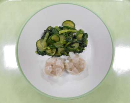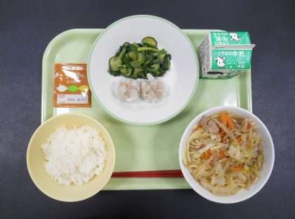 今日の献立は、「ごはん、牛乳、肉シューマイ、しょうがひたし、とんこつラーメン、大豆ふりかけ」でした。