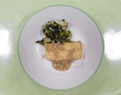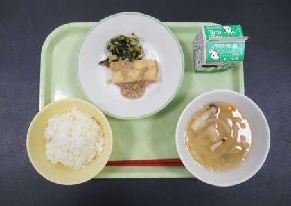 今日の献立は、「ごはん、牛乳、揚げ出し豆腐の肉みそかけ、磯和え、みそ汁」でした。