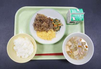 「ごはん、牛乳、ビビンバ(焼肉)、ビビンバ(ナムル)、ビビンバ(錦糸卵)、中華スープ」でした。