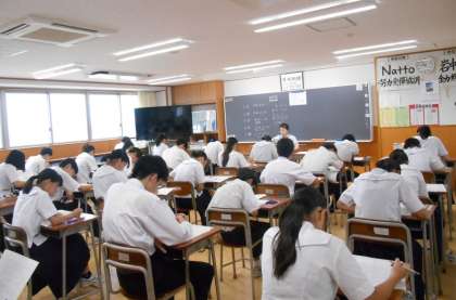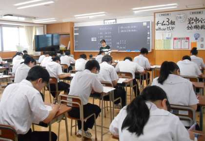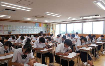 3年生は、1〜5限まで、社会・国語・理科・英語・数学の順で、実力テストを行っています。みんな真剣に集中して問題に取り組んでいます。