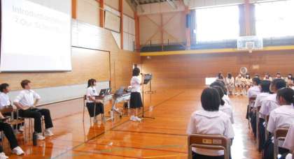 まず初めに、お互いの地域や学校に関するスピーチを英語で行いました。生徒たちは真剣に話を聞いていました。