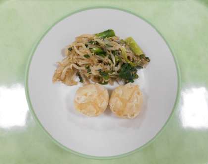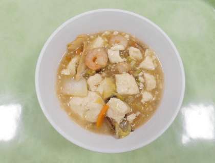 今日の献立は、「ごはん、牛乳、にんじんシューマイ、ナムル、えびと豆腐のうま煮」でした。