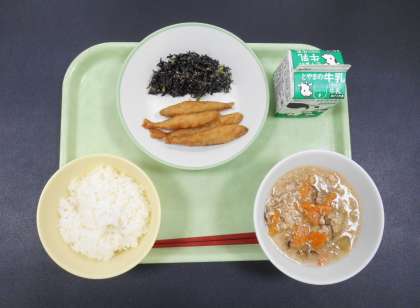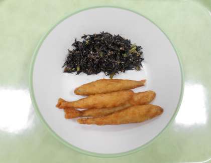 今日の献立は、「ごはん、牛乳、わかさぎのフリッター、ひじきのごま和え、冬瓜のそぼろあん」でした。