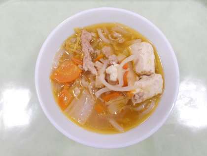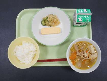 今日の献立は、「ごはん、牛乳、厚焼き卵、華風和え、韓国風すきやき」でした。