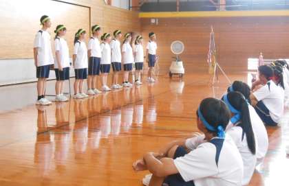 体育大会実行委員や係長の紹介、スローガンの発表、優勝旗・優勝杯の返還などを行いました。