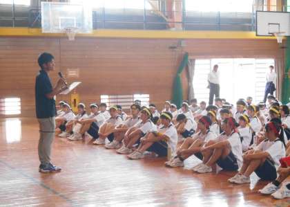 写真下:体育大会担当の先生からのお話