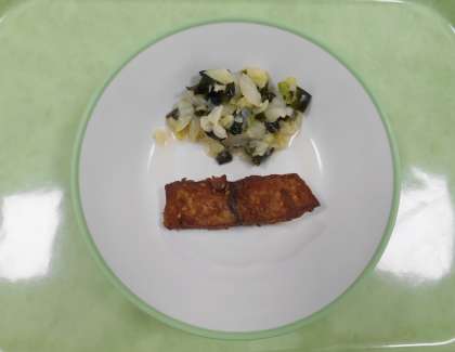 今日の献立は、「ごはん、牛乳、魚の利久揚げ、酢の物、みそ汁」でした。