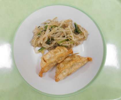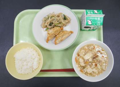 2学期最初の献立は、「ごはん、牛乳、揚げぎょうざ、塩ナムル、マーボー豆腐」でした。