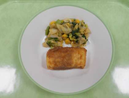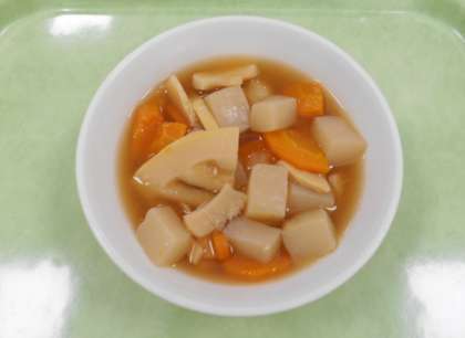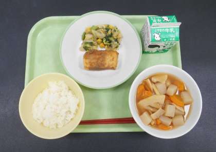 今日の献立は、「ごはん、牛乳、揚げ出し豆腐のごまだれかけ、コーン和え、大和煮」でした。
