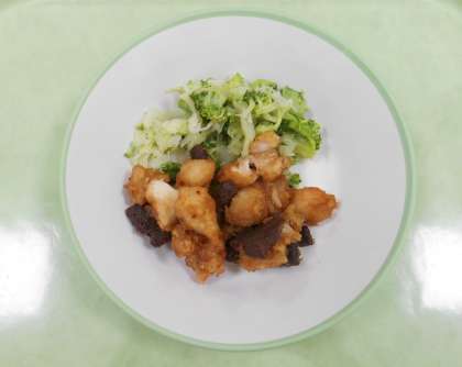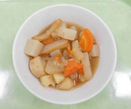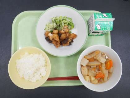 今日の献立は、「ごはん、牛乳、鶏肉とレバーのあまからめ、そえ野菜、炊き合わせ」でした。