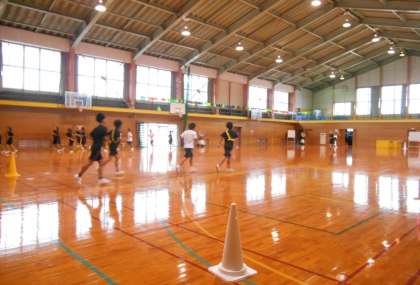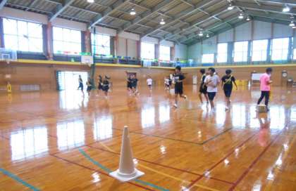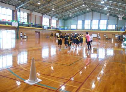 駅伝部は、今朝も雨が降っていたので、体育館でトレーニングを行いました。先生から黄色いたすきを渡されていました。