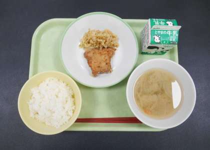 今日の献立は、「ごはん、牛乳、豚肉の香り揚げ、いり大豆和え、つみれ汁」でした。
